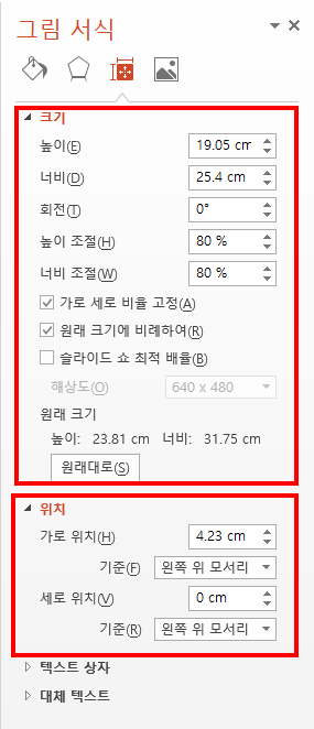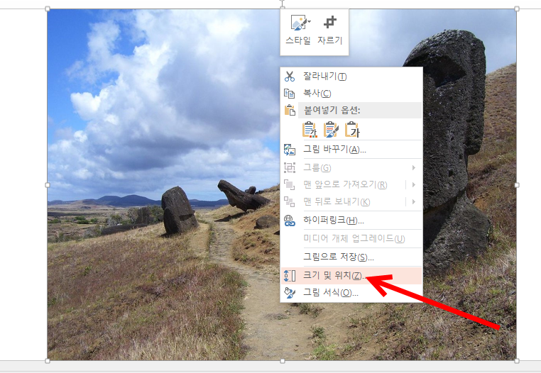 3)이미지를 선택하고 마우스 우클릭한후 크기 및 위치로 이동한다.