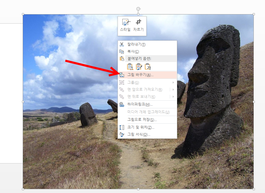 11)이미지를 선택하고 마우스 우클릭한후 그림바꾸기에서 교체할 이미지를 불러오기한다.