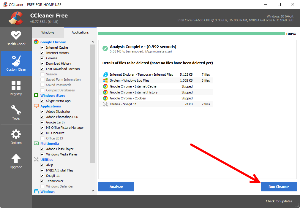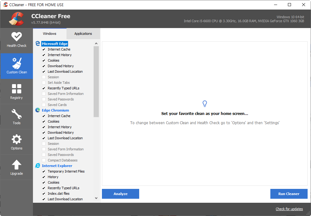 3)custom clean 메뉴에서 브라우저의 인터넷 캐시, 히스토리, 쿠키, 다운로드 히스토리 그리고 썸네일캐시, 시스템 임시파일, 메모리덤프, 파일조각, 윈도우 로그파일등을 정리하는 기능을 제공한다.