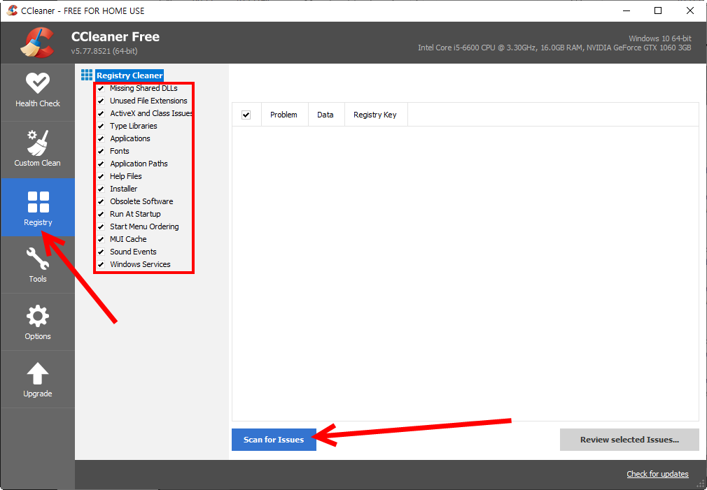 5)registry 메뉴에서 잘못된 레지스트리를 검사하고 정리하는 기능을 제공한다.
