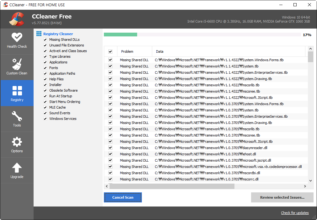 5)registry 메뉴에서 잘못된 레지스트리를 검사하고 정리하는 기능을 제공한다.