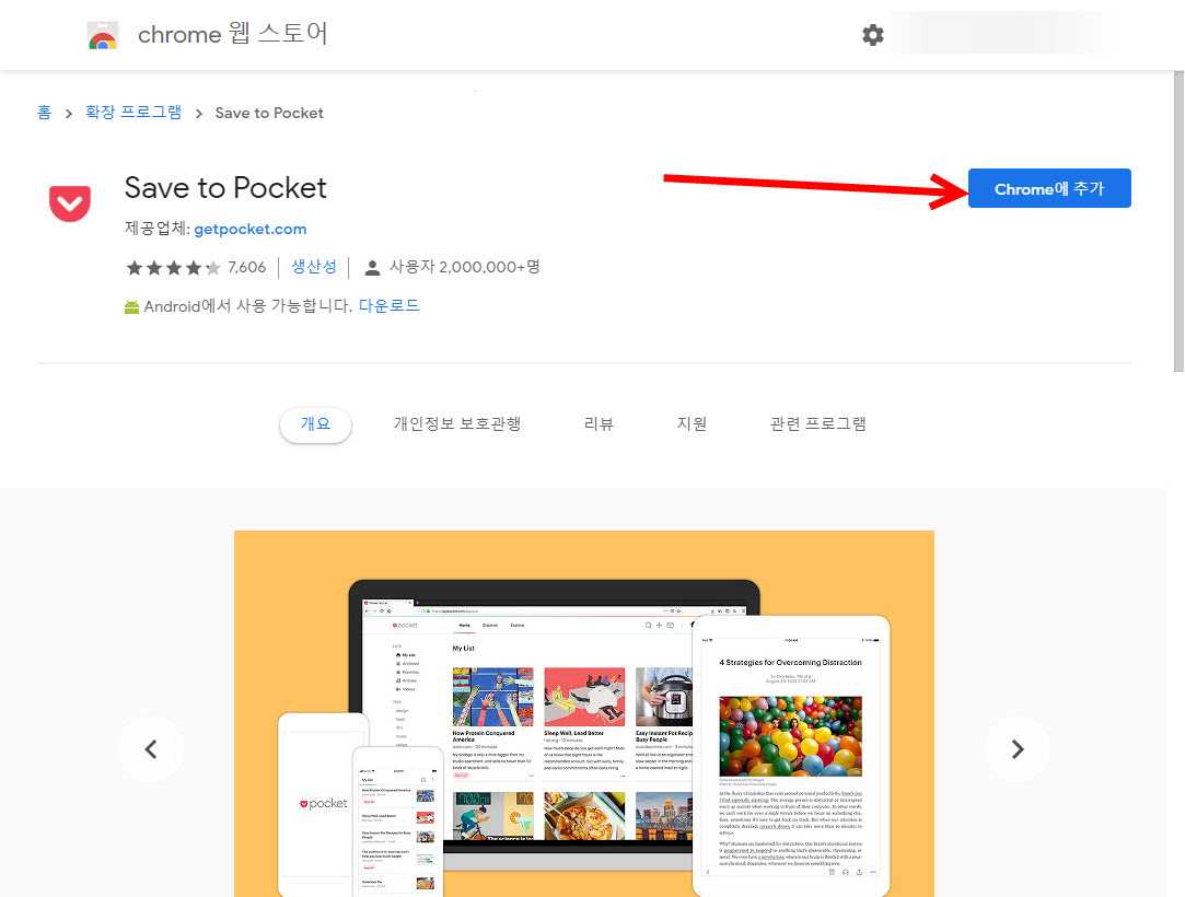 5)크롬에 pocket 확장프로그램을 추가한다.