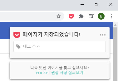 11)포켓이 추가된것을 확인할수있다. 포켓을 선택하면 현재 페이지를 저장한다.