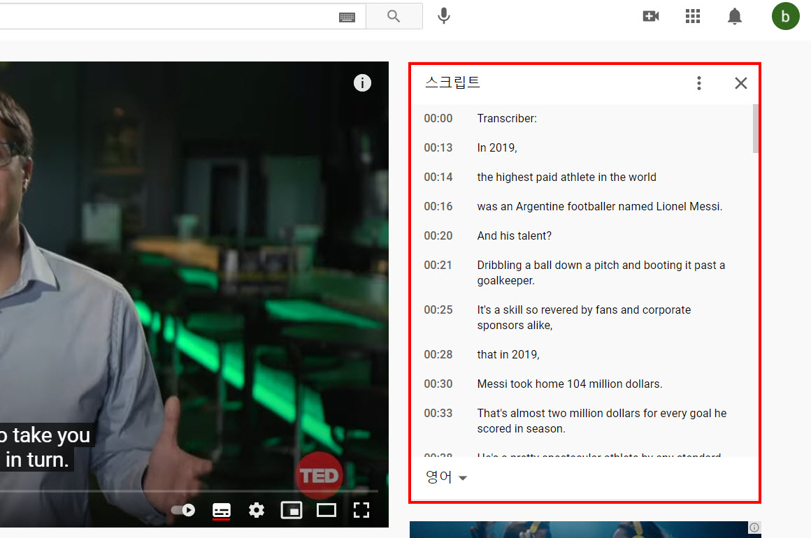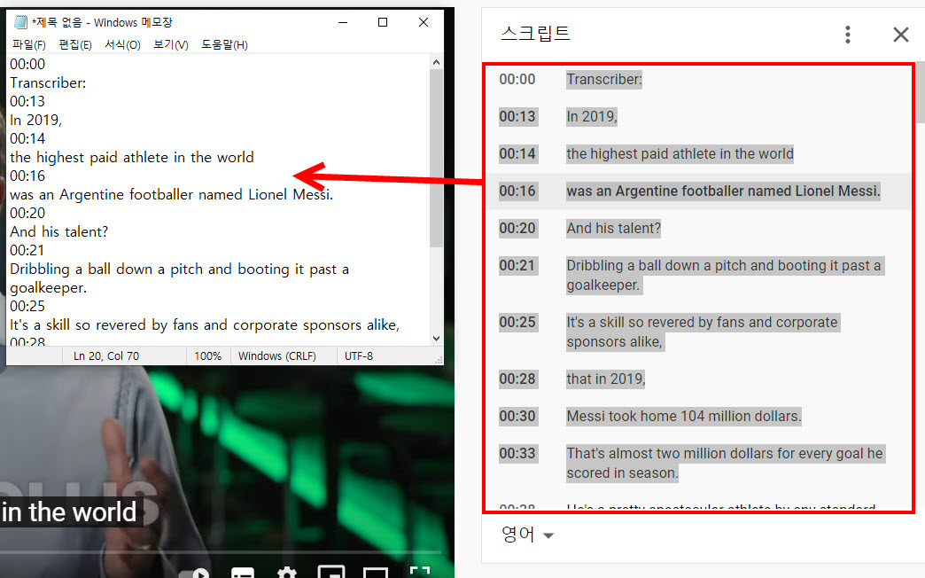 4)스크립트에서 동영상의 자막을 확인할수있다.