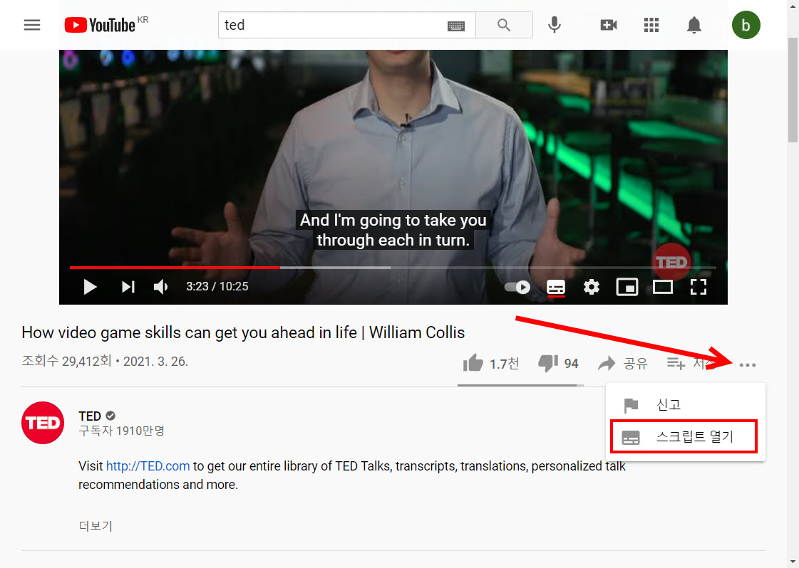 3)동영상의 자막이 존재하면 아래 표시한 클릭하고 스크립트 열기로 이동한다.