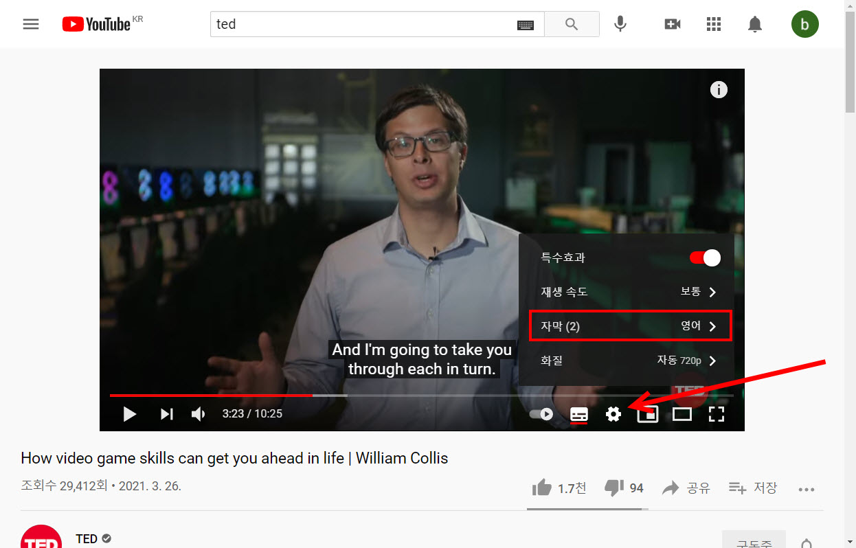 2)동영상의 자막 유무를 확인한다. 동영상 플레이어의 설정 아이콘을 클릭하면 동영상의 자막이 존재하는지 확인할수있다.