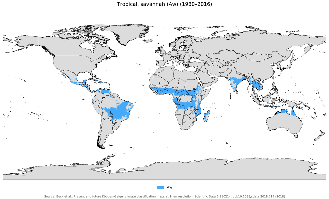 사바나 기후(Aw)는 주로 열대우림과 열대몬순 주변(아프리카 대륙의 일부와 중남미, 북호주 등)등의 열대 지역에서 발생하는 열대 기후 형태로 건기(평균 기온이 상대적으로 따뜻하고 건조한 기간)와 우기(습도가 높고 비가 내리는 기간)이 뚜렷한 특징이 있습니다. 주로 평야와 초원으로 이루어진 사바나는 다양한 종류의 동식물들이 서식하는 지역입니다.