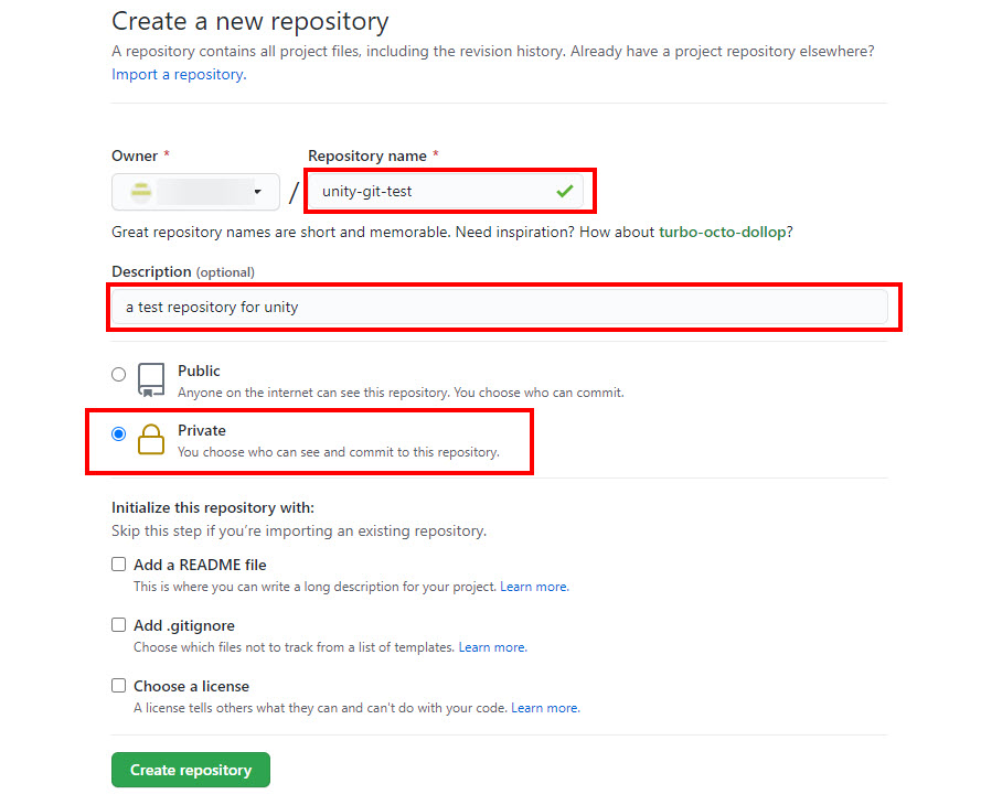 2)리포지토리의 이름(repository name)과 설명(description)을 기입한다.