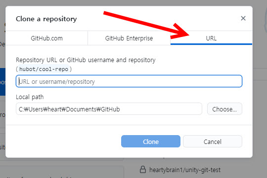 9)깃허브 데스크톱에서 복사한 URL을 붙여넣기한다.