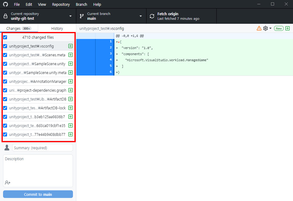 14)깃허브 데스크톱에서 리포지토리 변경사항을 표시한다. 유니티 프로젝트에서 생성한 파일 및 폴더의 추가사항을 확인할수있다.
