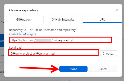 Local path에 복사할 리포지토리의 위치를 설정하고 clone을 클릭한다.