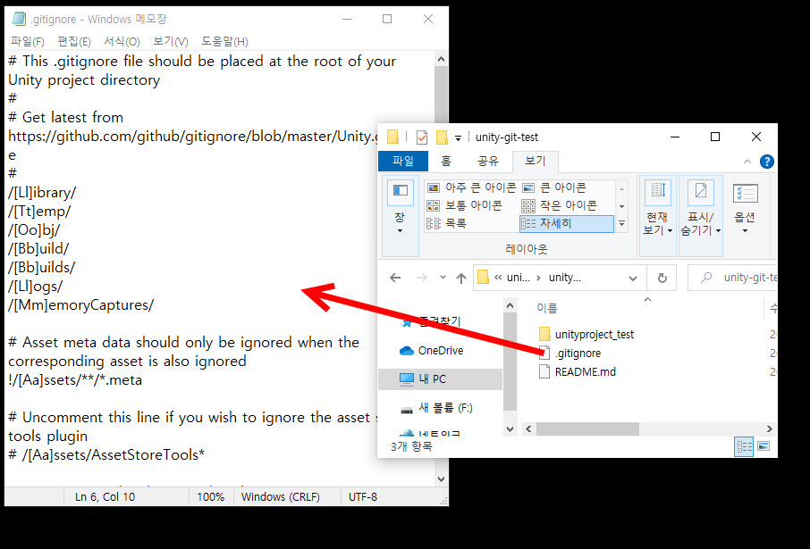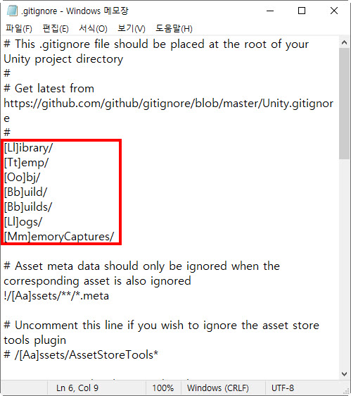 9)유니티 프로젝트의 파일 및 폴더중 추적에서 제외할 항목들의 주석 문자(comment character)를 제거하고 저장한다(/[Ll]ibrary/를 [Ll]ibrary/로 변경)
