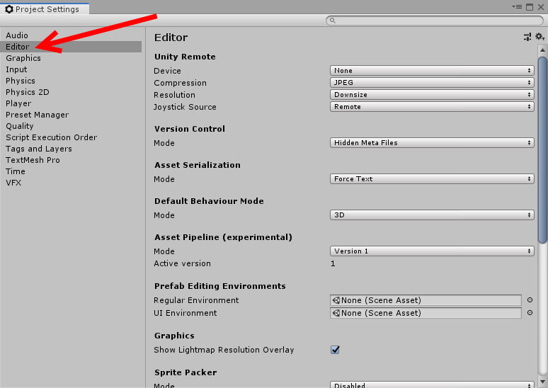 2)유니티에서 project settings의 editor로 이동한다.