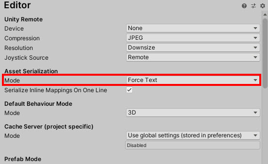 4)asset serialization의 mode에서 직렬화된 에셋을 저장하는데 사용할 포맷을 선택한다. 텍스트 모드인 force text를 선택한다.