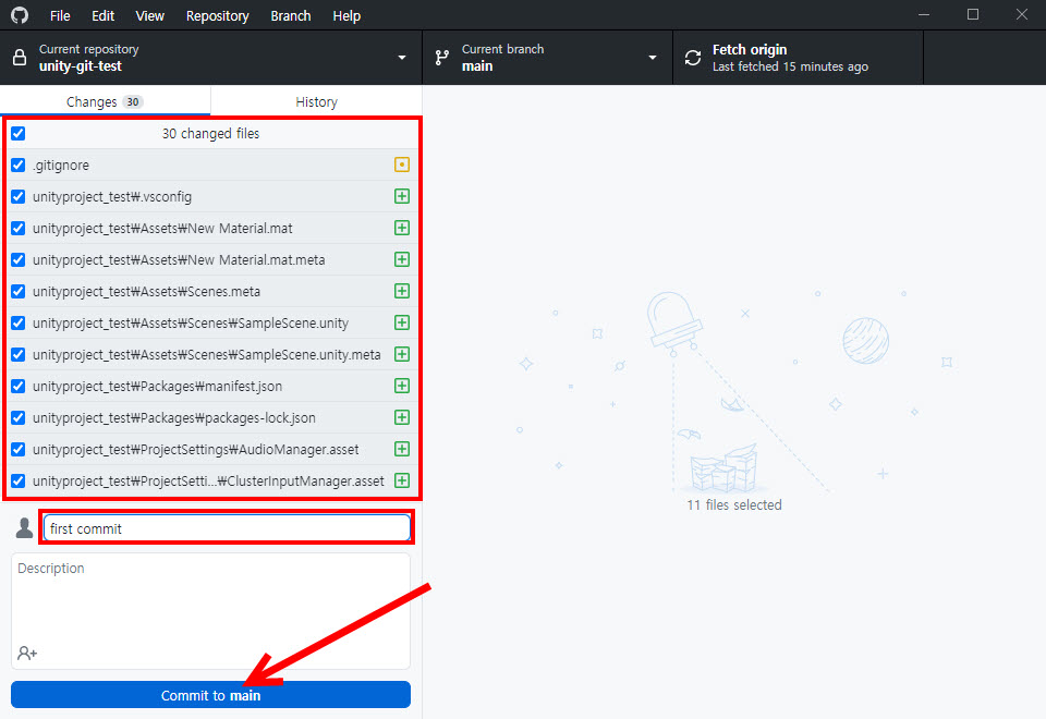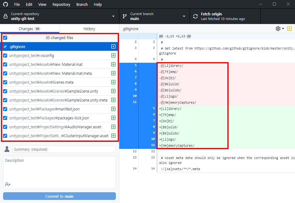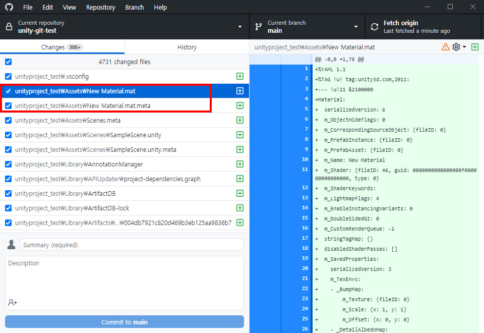 7)깃허브 데스크톱에서 유니티에 추가한 에셋과 에셋의 메타파일이 변경사항으로 추가된것을 확인할수있다.