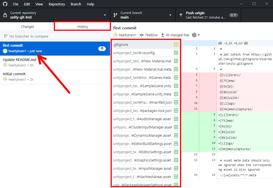12)history에서 추가된 커밋(commit)을 확인할수있다. 해당 커밋의 모든 변경사항을 확인할수있다.