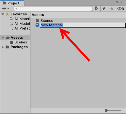5)프로젝트의 assets에 새로운 에셋을 추가한다. 예에서 새로운 재질을 생성하였다.