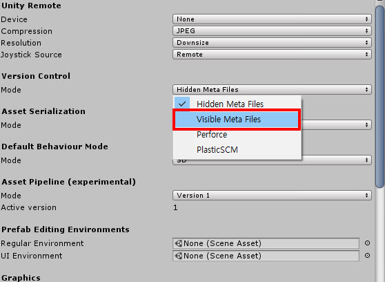 3)version control에서 visible meta files를 선택한다. 이 옵션은 윈도우의 프로젝트 폴더에서 에셋의 메타파일을 보기가능한 상태로 설정한다.