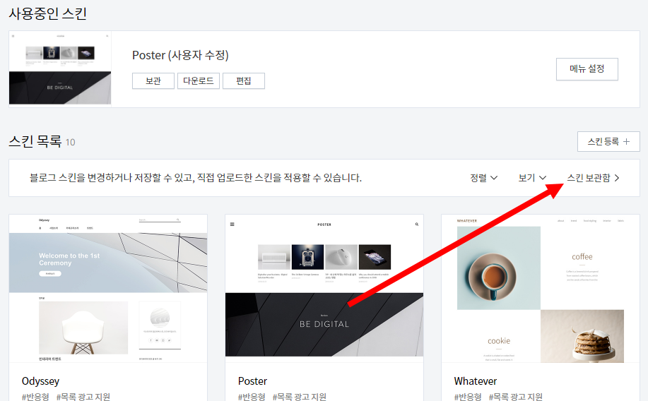 2)현재 사용중인 스킨을 확인할수있다. 해당 스킨을 보관 또는 다운로드할수있다.