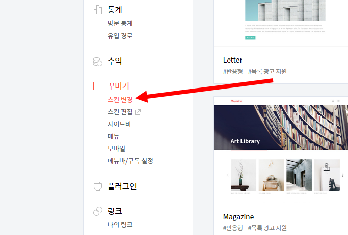 2)블로그 꾸미기의 스킨 변경으로 이동한다.