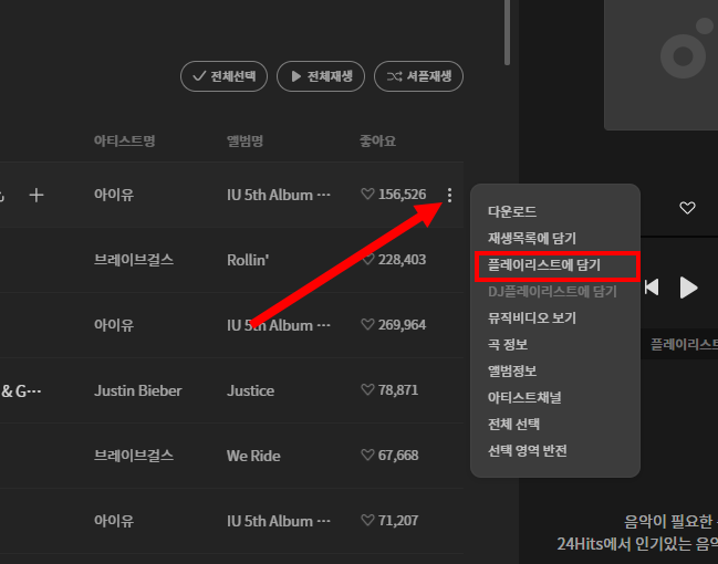 12)음악의 우측 아이콘을 클릭하고 플레이리스트에 담기를 선택한다.