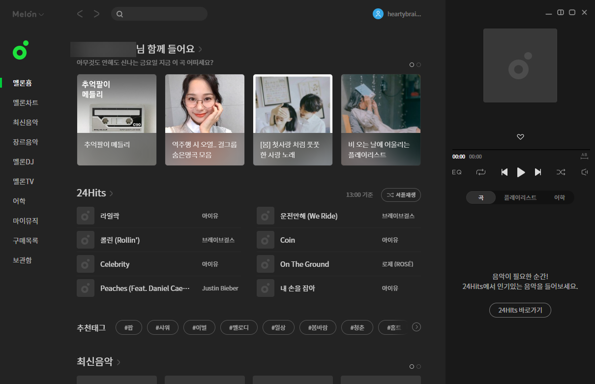 9)멜론 플레이어를 실행한다. 좌측에는 추천 및 검색 음악을 표시하고 우측에는 플레이어를 표시한다.
