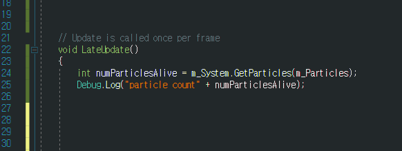 3)파티클 시스템의 현재 활성화된 파티클을 가져오고 개수를 출력한다.