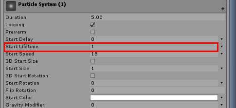 7)파티클의 시작 수명을 설정하였다(start lifetime-1)