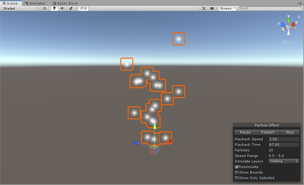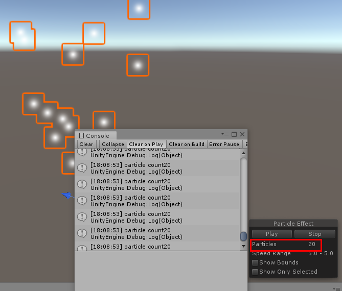 5)파티클 개수가 증가하여 최대 파티클 개수에 도달한다. 에디터에서 표시하는 현재 파티클의 개수와 동일한것을 확인할수있다.