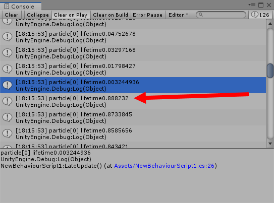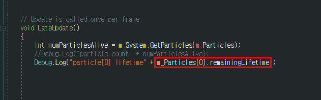 6)프레임마다 개별 파티클(예에서 0번 파티클)의 남은 수명을 출력한다(Particle.remainingLifetime)
