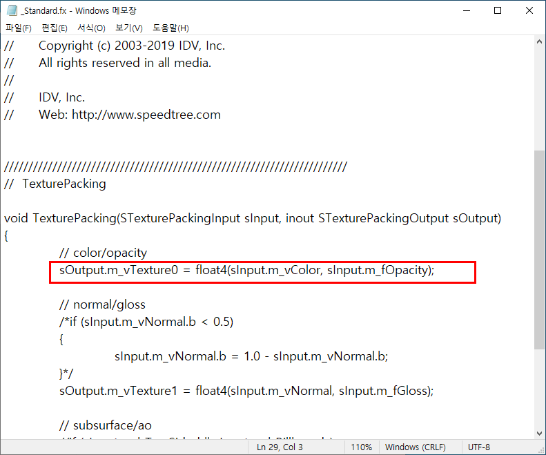 3)이 문제를 해결하기위해 스피드트리 프로그램 설치폴더에서 texture_packing 폴더로 이동하여 Standard.fx 파일을 메모장에서 열기한다.