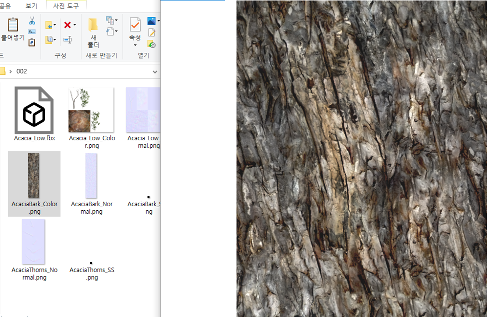 1)예에서 나무 모델 및 에셋의 내보내기 옵션에서 textures packing으로 standard를 선택하였다.