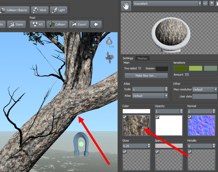 1)스피드트리 프로그램에서 모델이 사용중인 텍스처의 인풋 이미지가 정상적으로 표시되는것을 확인할수있다.