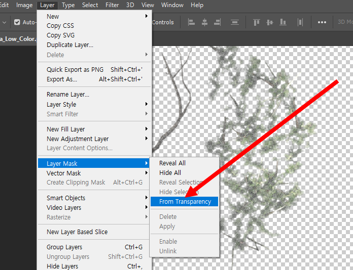6)상단의 layer 메뉴에서 layer mask의 from transparency를 선택한다.