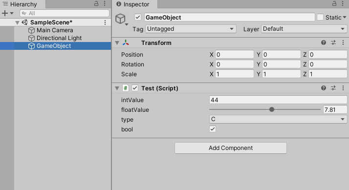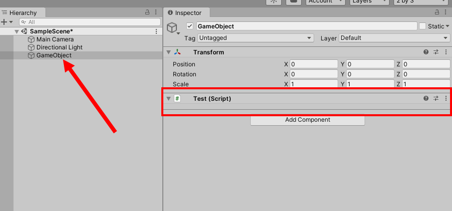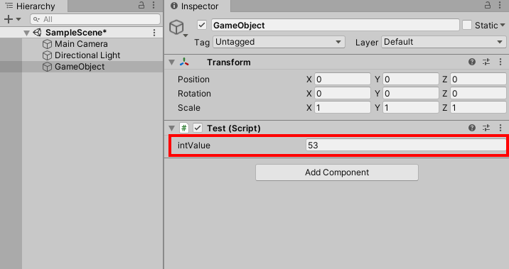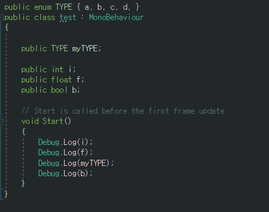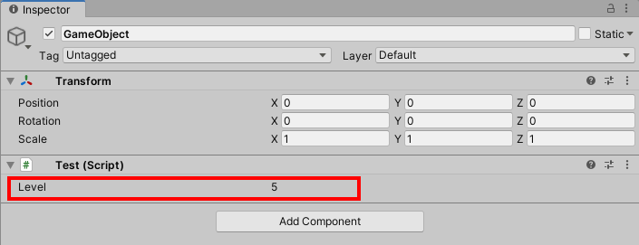 3)test 스크립트에 변수를 선언하고 씬의 게임오브젝트에 추가한다.
