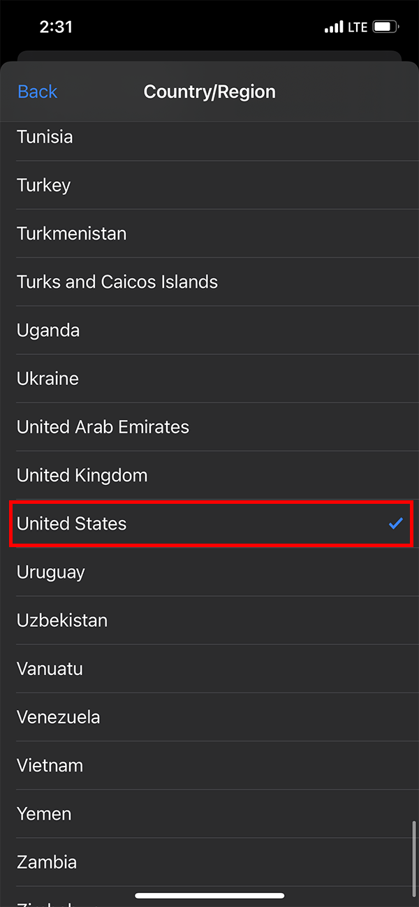 7)현재 애플계정에서 사용하고있는 국가에 체크되어있는것을 확인할수있다. 미국 계정으로 처음 가입한 애플계정의 경우 united states에 체크되어있다.