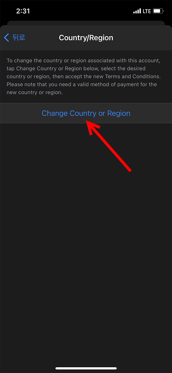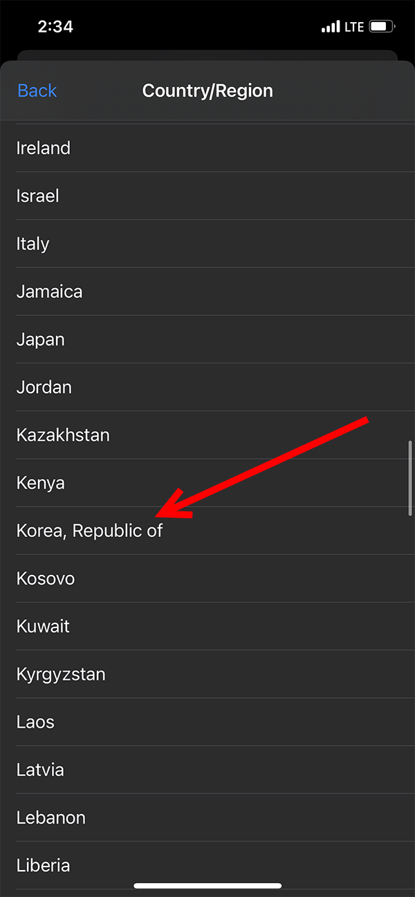 8)변경하고자하는 국가를 선택한다. 한국계정으로 변경하기위해 korea, republic of를 선택하였다.