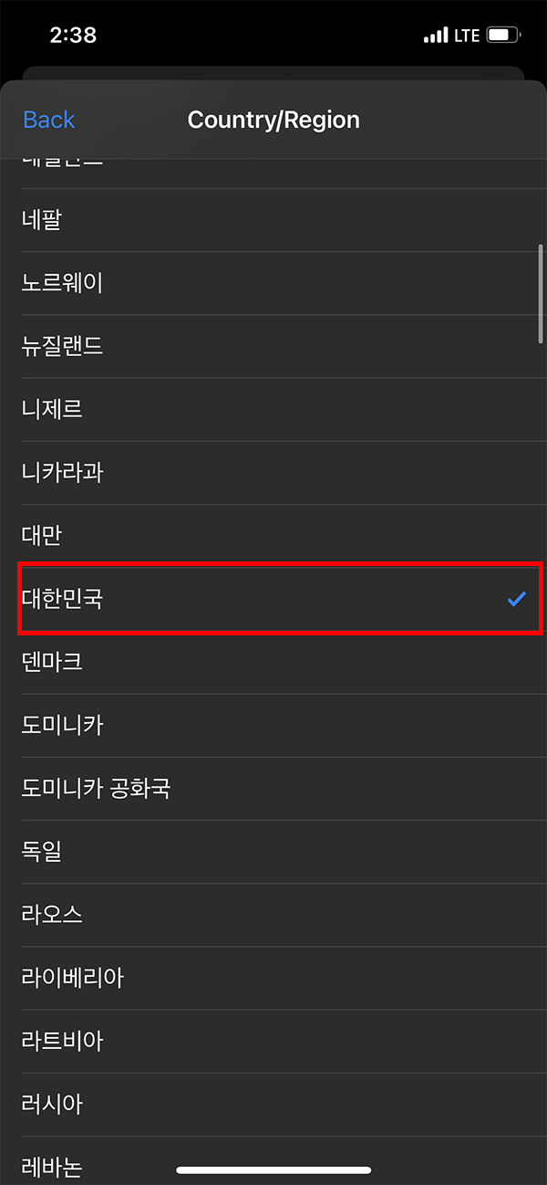 11)국가목록이 변경한 국가의 언어로 표시되며 해당 국가에 체크되어있는것을 확인할수있다.