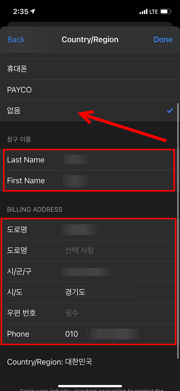 사용자의 이름 및 주소 정보를 입력하고 확인하면 애플계정의 국가 변경이 완료된다.