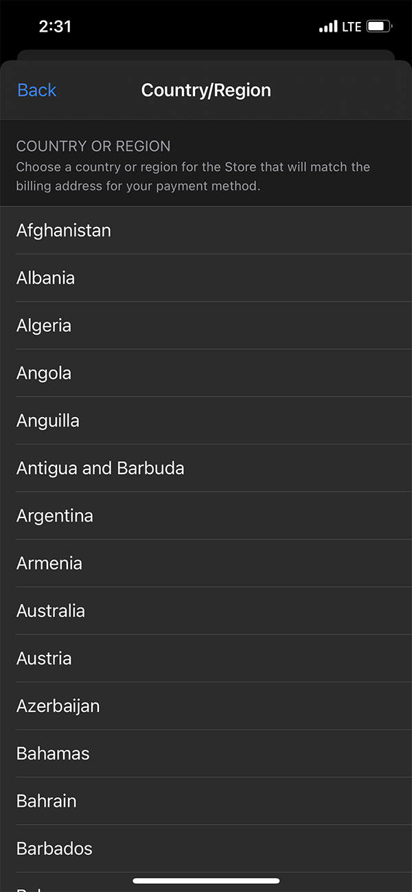 7)현재 애플계정에서 사용하고있는 국가에 체크되어있는것을 확인할수있다. 미국 계정으로 처음 가입한 애플계정의 경우 united states에 체크되어있다.