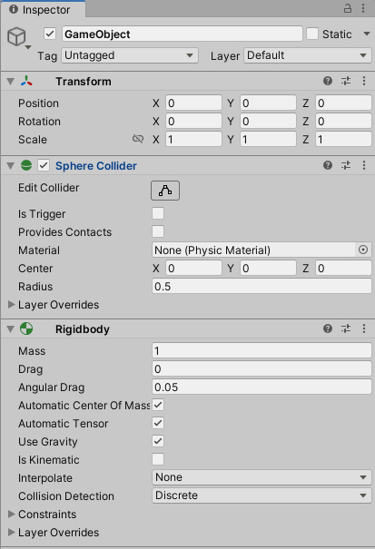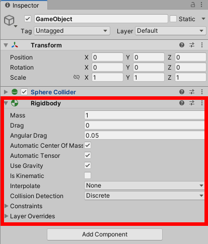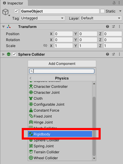 물리 엔진의 영향을 받기 이전에 게임오브젝트에 확실히 리지드바디가 추가되어야합니다. 게임오브젝트의 component 에서 physics의 rigidbody를 선택하여 리지드바디를 추가할수있습니다. 이로써 오브젝트는 물리반응에대한 준비가 되며 중력의 영향을 받을것이고 스크립팅을 통해 힘을 받을수있습니다. 하지만 게임오브젝트가 정확하게 원하는대로 동작하기위해서 콜라이더 또는 조인트를 추가해야합니다.