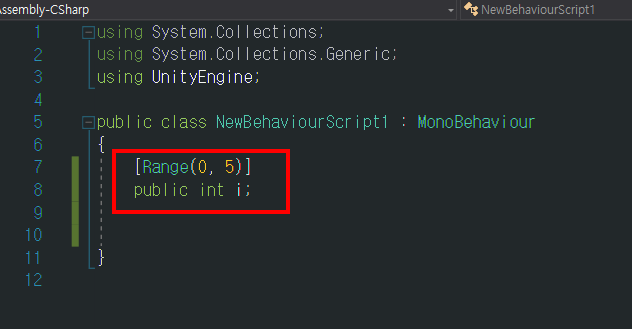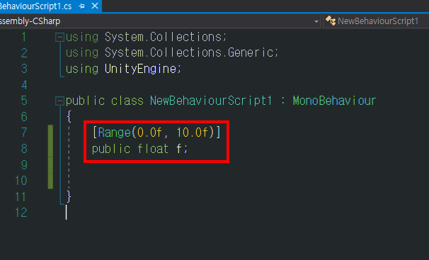 Range 어트리뷰트(RangeAttribute)를 사용하면 인스펙터에서 스크립트의 int 또는 float가 기본 숫자 필드 대신 슬라이더로 표시된다.