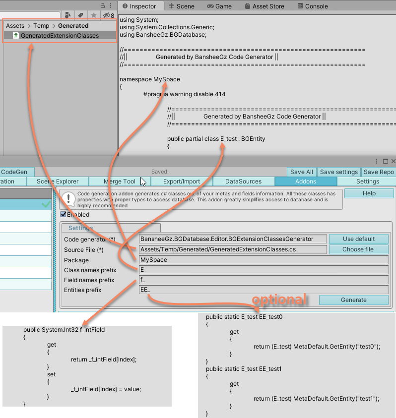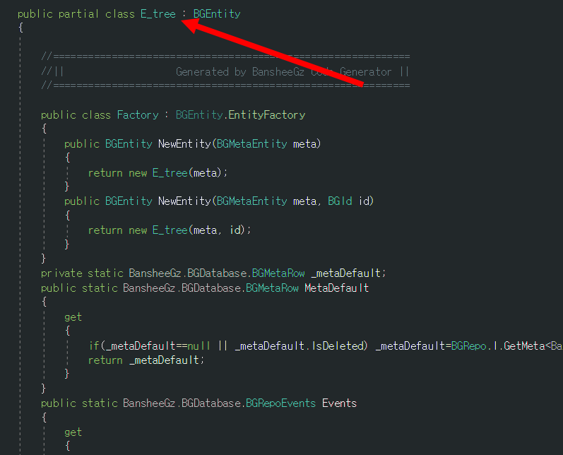 4)사용자가 설정한 metas, fields 정보로부터 c# 클래스를 생성한것을 확인할수있다. 생성한 스크립트에서 모든 클래스는 데이터베이스에 접근하기위한 적절한 형식의 프로퍼티를 가지고있다.