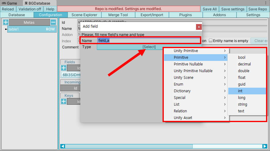 5)add field에서 필드의 이름과 타입을 설정한다. 아래 웹사이트에서 BGDatabase에서 지원하는 모든 필드 형식을 확인할수있다.