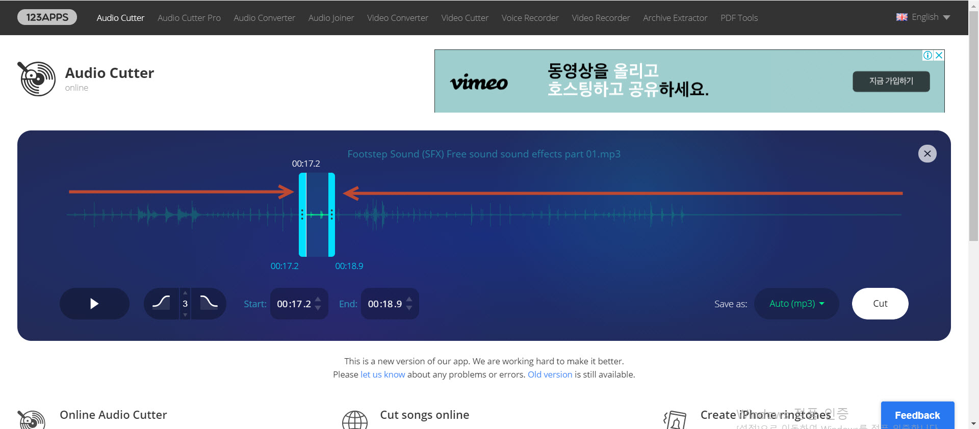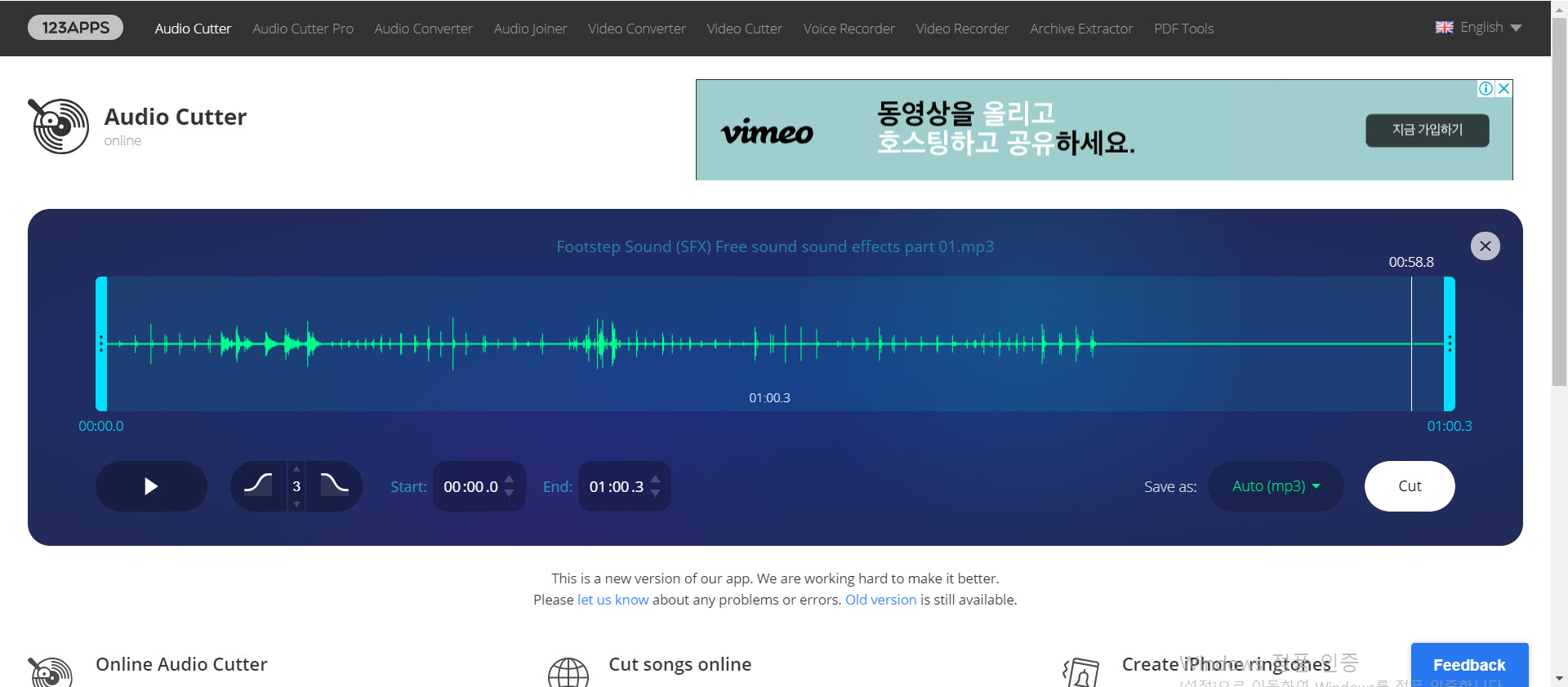 오디오 파일의 길이를 편집할수있는 웹사이트(audio cutter)
