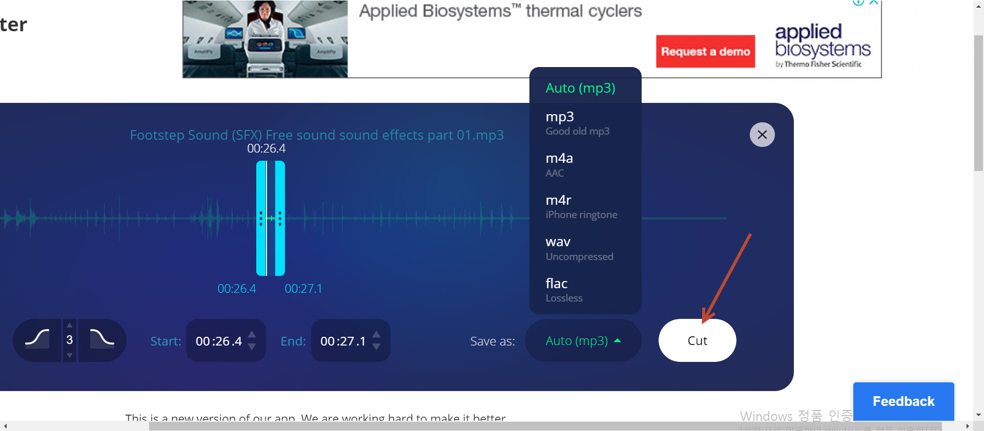 6)아웃풋 파일 확장자를 설정하고 cut를 클릭하면 편집한 새로운 파일을 저장한다(웹브라우저 다운로드 폴더)