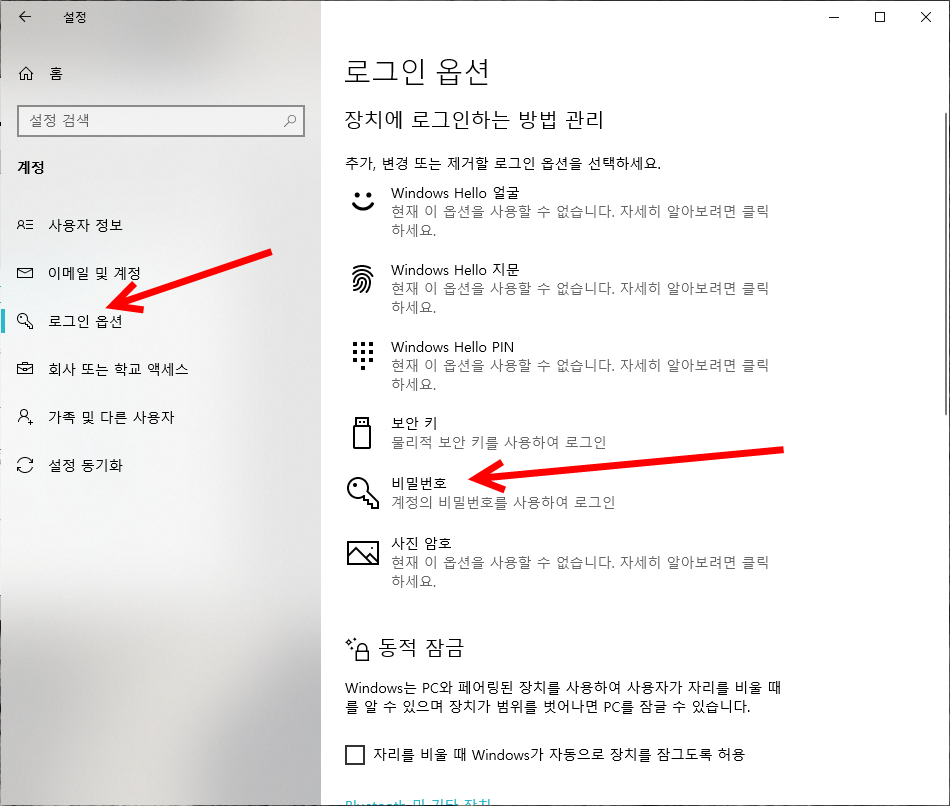 3)좌측에서 로그인 옵션을 선택하고 비밀번호를 클릭한다.