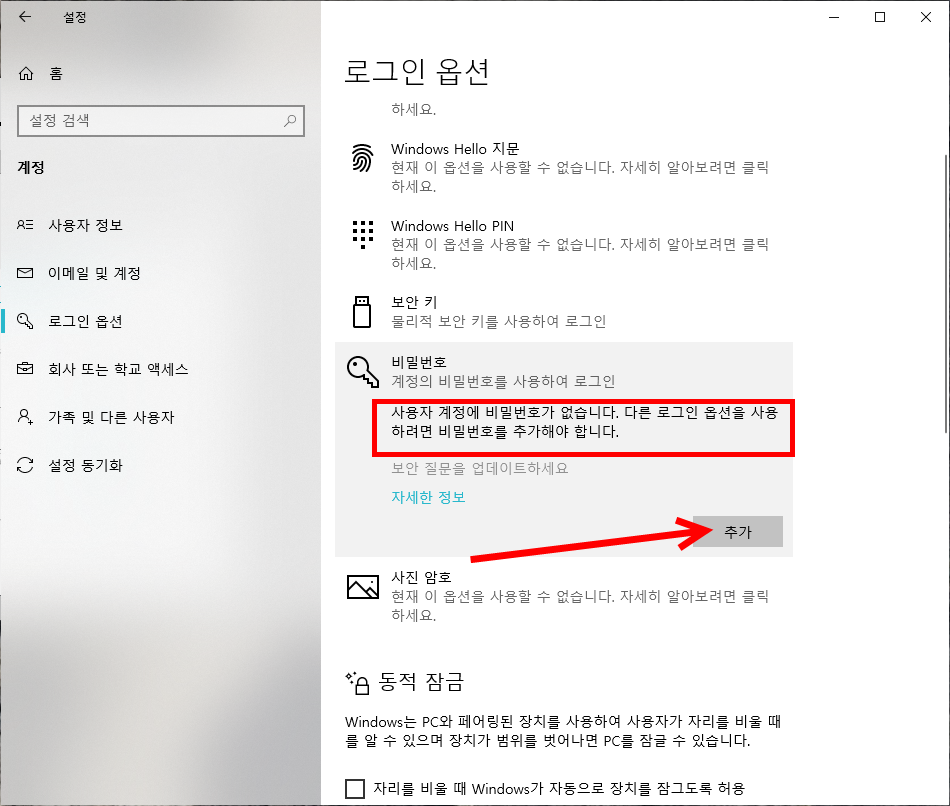 윈도우10에서 계정 비밀번호 추가하기(사용자 암호)
