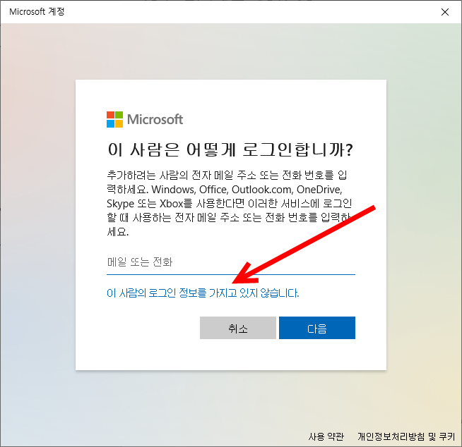 5)사용자의 메일 또는 전화번호 입력없이 진행하려면 이사람의 로그인 정보를 가지고 있지 않습니다를 선택한다.