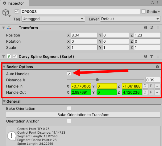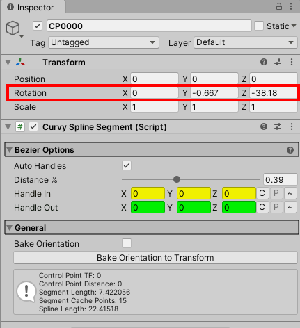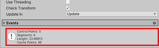 6)컴포넌트의 하단에서 스플라인을 구성하는 포인트(CP, control points)와 포인트를 잇는 선의개수(segments), 스플라인의 길이(length), 캐시포인트가 표시되는것을 확인할수있다.